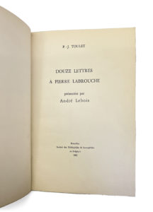 12 lettres à Pierre Labrouche. Editions Société des bibliophiles et iconophiles de Belgique. Bruxelles 1962. E.O. L'un des 40 ex sur Arches, seul grand papier. Dédicace du Président de la Société, Auguste Lamblotte à Jean de BUZELET. Jointes...