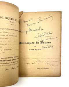 RICTUS Jehan : Les soliloques du pauvre. Ed Cabaret des quat'z'arts/Au chat noir Paris 1895. Dédicace de Rictus à Maurice SAILLAND (CURNONSKY) datée d'avril 1896. Notes autographes de Toulet sur la propriété du livre que Curnonsky s'était...