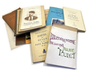 des contrerimes, tiré à part Le livre et l'estampe 1962/ Jean-Marie ROUART, Statuts de l'arc-en-cile de Toulet 2004/ Jean-Louis VAUDOYER, Martineau poète, Les cahiers de marottes et violons d'Ingres 1960/ Jean-Louis VAUDOYER, Henri Martineau, Tiré à part de la revue des deux mondes 1958/ Daniel ARANJO, Toulet et l'île Maurice ; tiré à part S.D ni lieu/ TOULET, c'était un jour, revue Odeur du temps 1961/ TOULET, Vous qui n'avez, revue Odeur du temps 1962/ Noël REGNEW, Souvenirs et rencontres d'Alain Gérard Ed O.L.B 1955/ Michel BULTEAU, Toulet l'enchanteur désenchanté Ed J et D Biarritz 1987/ henri MARTINEAU, Toulet, Jean de Tinan et madame Bulteau Le divan 1958/ Daniel ARANJO Toulet, la vie et l'œuvre Marrimpouey Editeur Pau 1980/ Daniel ARANJO, Toulet l'esthétique Marrimpouey Editeur Pau 1980/ Armand Got et Louis DUCLA, Poètes du Béarn et du pays basque Ed d'Aquitaine 1961/ Catalogue de l'exposition Paul Jean Toulet à la Bibliothèque nationale Mai-Juin 1968 et l'affiche correspondante.