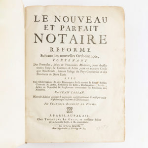 (notaire) Jean Cassan, Le nouveau et parfait notaire. Paris, chez Théodore Le Gras, 1749. In-4°. 1blanco, titre, (xv), (vii), 928pp.num. Plein veau marbré d'époque, dos à cinq nerfs.