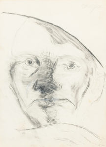 PJEROO ROOBJEE (°1945) Sans titre, vers 1967. Crayon gris et crayon de couleur. Signé au crayon. Avec annotation sur le cadre au verso 'Dag / zo zijn wij / Brief Encouter/ Roger Raveel 2 mei 1967'. Aussi signé par l'artiste. Cadre.