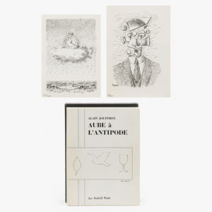 (Magritte) Alain Jouffroy, Aube à l'Antipode. Carnet de bord tenu sous forme de notes analogiques expéditives. Dessins de René Magritte. (Paris), Le Soleil Noir, (1966). In-8°. 124 pp.num. Tir. lim. et num. à la presse, un des qqs ex. marqués...