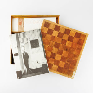 including a copy of H. Vuibert, Les Anaglyphes geometriques (Librarie Vuibert : Paris 1912) (with 3D-glasses) and a reproduction of a page from The Blind Man No. 2 (P.B.T.); a book with articles on Duchamp by André Breton and Arturo Schwarz (inserted, on a separate sheet, a reproduction of Le Grand Verre); an audiocassette of Duchamp speaking; a single photograph of ‘Marcel Duchamp at the Age of Eighty-Five’ for View’s special Marcel Duchamp number. All of these items are packed in a wooden box, the top and bottom of which being reproductions of Duchamp’s ‘mental’ Chess Board. Edition of 1000 numbered copies.