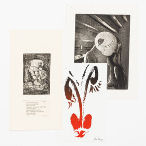 FRED BERVOETS (°1942) Eau-forte, aquatinte. Signée au crayon. Annotation 'EP'. Sur la même feuille est gravé un poème de K. Ringoet. On joint: - une eau-forte de Roger Van Akelyen et une sérigraphie de Jan Cox.