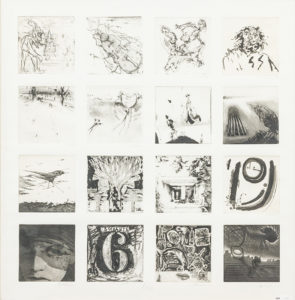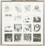 FRED BERVOETS (°1942)/ ROGER VAN AKELYEN/ ROELANT/ WILFRIED PAS e.a. Sans titre. Eau-forte. Un lot varié de seize, sur une feuille. Toutes signées au crayon. Autres planches d'André Goezu, Walter Brems, Hugo Besard, et al. Cadre.