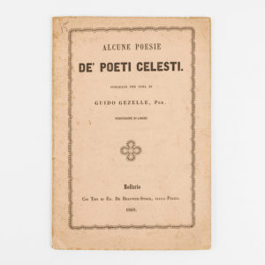 Guido Gezelle - Alcune poesie/ De poeti celesti. Rollario, Ed. De Brauwer - Stock, 1860. 12mo. 20 gen.pp. Ingenaaid onder orig. omslag. Licht bevuild, voorts heel mooi exemplaar van deze fragiele uitgave.