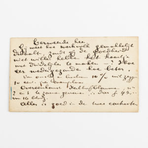 Kaartje van uitgever Edward Gaillard aan Guido Gezelle (op naamkaartje van die andere drukker Siffer, uit Gent). Zwarte inkt, recto verso. Gaillard heeft het over de commissies van gezelle zijn boekuitgaven etc. en eindigt met de woorden 'Wij zullen...