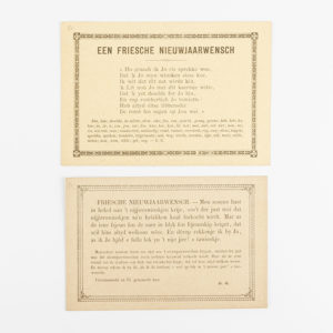 Guido Gezelle - 'Friesche Nieuwjaarwensch', 1888. Postkaart, alleen recto bedrukt. Met postzegel. Bijgevoegd van dezelfde: 'Een Friesche Nieuwjaarwensch', 1891. Postkaart, alleen recto bedrukt. Niet verstuurd.