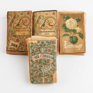 Guido Gezelle - Duikalmanak 1886. Los 16mo. Met aantekeningen door Gezelle in blauw potlood. Los, voorplat bewaard. Bijgevoegd: Duikalmanak 1893 - 1897 en 1899. 16mo. Orig. omslagen (ex. van 1893 volledig los).