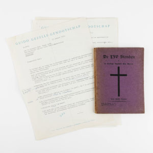 Guido Gezelle - De XIV Stonden of de bloedige dagvaart Ons Heeren. Kortrijk, Eug. Beyaert, 1911. Kl. vo. Orig. gekartonneerde band. Exemplaar uit het bezit van Stijn Streuvels, geschonken door Isa Lateur. Bijgevoegd: Brief van het Guido Gezelle...