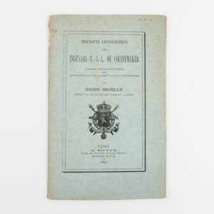 Guido Gezelle - Beknopte levensschets van Ingenaas-H.-J.-L. De Coussemaeker. Gent, A. Siffer, 1891. 8vo. 26 gen.pp. Ingenaaid onder orig. omslag. Rug bovenaan licht beschadigd. Met handgeschreven opdracht van Gezelle bovenaan het voorplat 'v.d.s.'...