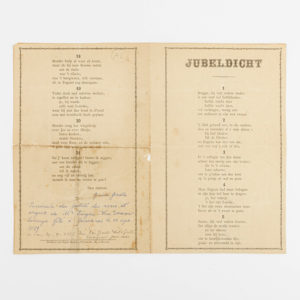 Guido Gezelle - Jubeldicht (1885). 8vo, 4 ongep. blz. 'Brugge, bij veel andere steden...'; 21 × 6 rr. Omlijst. Onderaan p. 4 'Drukkerij van Eugène Beyaert, Palfynstraat, 18, te Kortrijk'. Tweemaal gevouwen, vouwen verzwakt en lichtjes ingescheurd...