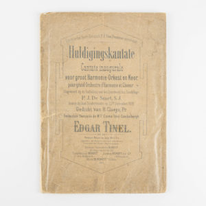 Edgar Tinel - Huldigingskantate/ Cantate inaugurale/ voor groot Harmonie-Orkest en Koor. Met opdracht aan Guido Gezelle. Brussel, gebroeders Schott, (1878). Gr. 8vo. 65 gen.pp. Met handgeschreven opdracht op de titelpagina van de componist aan Guido...