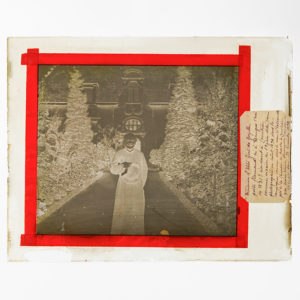Guido Gezelle - Oorspronkelijk glasnegatief van Gezelle op het buitenverblijf 'Patersmote'. De foto werd genomen door Marie-Thérèse Vercruysse in de zomer van 1898. Zij was de dochter van Victor Vercruysse. Deze laatste was toen, samen met zijn...
