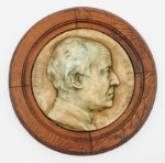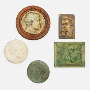 Gevarieerd lot van vijf herdenkingsplaketten met voorstelling van Guido Gezelle, Albrecht Rodenbach en Hugo Verriest. Rond en rechthoekig. Gepatineerd plaaster. Verscheidene diameters. Waaronder één gemaakt door Jules Lagae (1862-1931). Barst en...