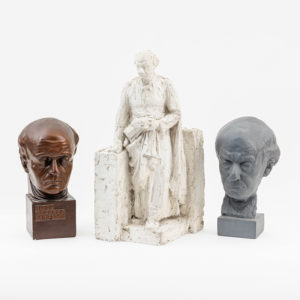 OSCAR JESPERS (1887-1970) Portrait de Guido Gezelle, 1929. Plâtre gris patiné. Signé. On y joint: Dépliant permettant de souscrire à un exemplaire de cette sculpture, au prix de 150 Bfr. Ci-joint: deux autres sculptures représentant Guido...