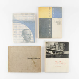 Breuer: Architect and Designer. New York, Architectural Record/ Museum of Modern Art, 1949. 8vo. 128 p. Couverture rigide. Carton toile bleu marin avec des lettres dorées sur la couverture et le dos, jaquette blanche avec des lettres rouges, illustration en noir et blanc sur la couverture. Et: S. Giedion - Walter Gropius. L'homme et l'œuvre. Paris, Éditions Albert Morancé, 1954. 8vo. 249 pp. num. Orig. toile noire, jaquette illustrée. Traces d'usure. Édition française. Et: Richard Neutra. Buildings and Projects/ Réalisations et Projets/ Bauten und Projekte. Zurich, Editions Girsberger, 1951. 8vo obl. 239 pp. num. Toile grise d'origine. Tacheté.