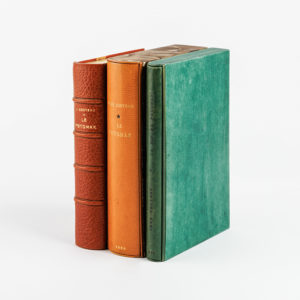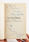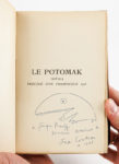 étui bordé du même. On y joint du même: Le Potomak 1913 - 1914/ précédé d'un Prospectus 1916. Paris, Librairie Stock, 1924. 8vo. 341 pp.num. Ex. du tirage courant sur Pur Fil du Marais, nr. 348. Avec déd. aut. signée et petit dessin pour Jacques Rouff sur le faux-titre. Br. sous couv. orig. Sous étui de mar. caramel à bandes, plats de papier marbré dans les tons, serti d'un filet doré (dos passé), étui bordé du même (A. Masui). Et: Idem. Ex. nr. 356. Avec déd. aut. signée à Raïna et dessin représentant une tête d'homme en profil au bic bleu sur le faux-titre. Rel. mod. en demi-mar. brun à coins, dos à nerfs, tête dorée, couverture.