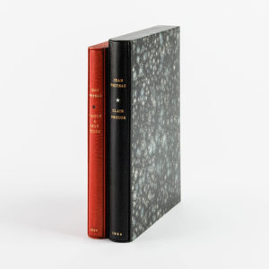 Edmond Limbourg/ ce souvenir/ bien amical/ de/ Jean Cocteau'. Br. sous couv. orig. Sous chemise en demi-mar. rouge à bandes, plats de papier dans les tons rouge et noir, sertis d'un filet doré, dos lisse, étui bordé du même mar. On joint du même: Clair obscure. Poèmes. Monaco, Éditions du Rocher, (1954). 8vo. 200 pp.num. Avec déd. aut. signé. Broché sous couv. orig. Sous chemise en demi-mar. noir à bandes, plats de papier marbré noir et blanc, sertis d'un filet doré, dos lisse, ét bordé du même (A. Masui). Provenance: Lowie Peeters; Jos Verheyen.