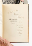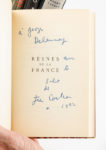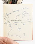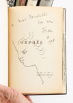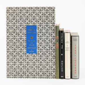 Ariane Pathé/ Souvenir amical/ de/ Jean Cocteau/ 1960'. Cartonnage mod. à la Bradel, étiquette de mar. bleu central sur le prem. plat avec titre, cinéaste et date, couverture. - Orphé. Film. Photographies de Roger Corbeau. Paris, Éditions André Bonne, (1950). 8vo. Ex. du tirage courant. Avec déd. aut. signé à Max Favalelli et dessin d'une tête d'un jeune garçon en profil à l'encre sur le faux-titre. Rel. mod. en demi-mar. noir , plat de papier fant. en noir et blanc, serti d'un filet blanc, dos lisse, couverture (A. Masui). - Roger Lannes. Poètes d'Aujourd'hui 4. Jean Cocteau. Nouvelle édition refondue et complétée. (Paris), Éditions Pierre Seghers, (1955). 12mo. Avec belle déd. aut. signée et dessins de deux têtes à Fernand Desonay sur le faux-titre. Cart. mod. en bleu, rouge et gris à la Bradel, couverture, étui bordée de mar. bleu (A. Masui). - Le Cordon Ombilical. Souvenirs. (Paris), Plon, (1962). 8vo. 81 pp.num. Ex. du tirage courant. Avec belle déd. aut. signée sur le faux-titre à Fernand Desonay. Cart. mod. à la Bradel de papier fait à la main dans les tons vert et rouge, couverture. - Reines de la France. Paris, Bernard Grasset, (1952-. 8vo. Ex. du tirage courant. Avec déd. aut. signée à Georges Delaunay sur le faux-titre. Rel. mod. en demi-mar. blanc à bandes, plats de papier marbré de tons rouges et noir, serti d'un filet en noir, dos lisse, couverture, étui bordé de mar. noir (A. Masui). Provenance (ensemble): Lowie Peeters (ex-libris); Jos Verheyen.