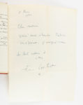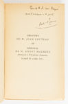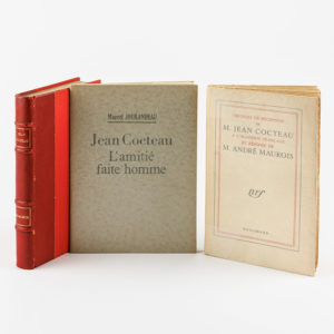 '1950'. - André Maurois. 'Propos (?) Littéraires/ Cocteau bon artisan'. Manuscrit. aut. signé. 1p. recto/ verso. Avec corrections. - coupure de presse. Rel. orig. en demi-mar. rouge, dos à nerfs, tête dorée, couvertures. On y joint: Discours de M. Jean Cocteau à L'Académie Française et réponse de M. André Maurois. (Paris), Librairie Gallimard, (1955). 8vo. Avec déd. aut. signée de Maurois. Br. sous couv. orig. Et: Marcel Jouhandeau - Jean Cocteau. L'amitié faite homme. Liège, Editions Dynamo, s.d. 8vo. Un des 10 ex. de tête sur Hollande, nr. 6, paraphé par l'éditeur. Avec lettre aut. signée de Jouhandeau. 52p. 8vo, encre noire, signée. Br. sous couv. orig. Provenance: Lowie Peeters; Jos Verheyen.