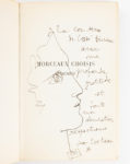 tête d'homme en profil sur le faux-titre: 'A la comtesse/ de Cossé Brissac/ avec/ ma/ profonde/ gratitude/ et/ toute/ mon/ admiration/ respectueuse/ Jean Cocteau/ 1933'. Broché sous couv. orig. avec en plus un petit dessin à l'encre brune représentant une tête d'homme, monogramme. Sous emb. de plein mar. vert foncé, le plat sup. avec plexi comme un écrin, dos lisse. Provenance: Lowie Peeters; Jos Verheyen.