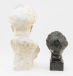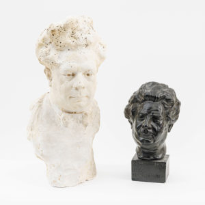 Gevarieerd lot van twee bustes met voorstelling van Felix Timmermans. 1. Hildebert Derre (1886-1966). Buste, 1947. Zwart gepatineerd plaaster. Gesigneerd en gedateerd. H.: 37 cm 2. Achiel Jan Frans Moortgat (1881-1957). Buste. Plaaster. Gesigneerd....