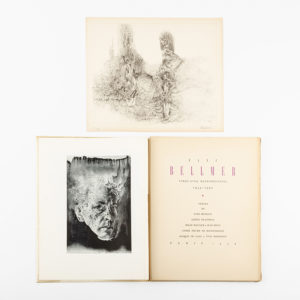 Bellmer), feuillet avec titre imprimé en magenta et noir, 11 feuillets avec texte (voir ci-dessous), titre de section et 9 feuillets de papier glacé avec 23 reproductions monochromes d'œuvres de Bellmer, feuillet avec “Table” recto et verso, feuillet avec 'Notes Bibliographiques', dernier feuillet avec achevé d'imprimer et justification et une reproduction de Bellmer en magenta; on y trouve aussi, insérée à la suite, la gravure originale de Bellmer avec une numérotation correspondant à celle du livre. L'ouvrage est présenté en feuilles, tel qu'il a été publié, dans les couv. imprimées d'origine de l'éditeur, avec des titres imprimés en noir et en magenta sur la couverture avant. Emb. de protection en maroquin marron, plats avec un filet doré en encadrement, dos à bandes avec titre doré en six compartiments. L'un des premiers livres consacrés à l'œuvre de Hans Bellmer, l'édition rare signée par Bellmer, avec une gravure originale signée et des contributions de ses amis et collaborateurs. De l'édition limitée à 415 exemplaires numérotés, dont celui-ci de 99 sur vélin de Lana signé par Bellmer, n° 2, et avec une gravure originale numérotée et signée de l'édition de 30 et correspondant au numéro du livre; la gravure de Bellmer est d'après son dessin original 'Le Vermoulu et le Plissé' (voir pg. 38). Bien que la justification indique que 415 exemplaires ont été tirés, une note de l'éditeur dans un autre exemplaire (l'exemplaire Filipacchi - voir ci-dessous) indique qu'en réalité seuls 30 exemplaires - et non 99 - ont été tirés avec une gravure et que sur ces 30, seuls 20 ont été signés : « Il n'existe en réalité qu'un tirage à 30 ex[emplaires]. au lieu de 99 ex[emplaires]. dont 20 ex[emplaires]. seulement ont été signés ... ». Les textes ou poèmes du livre, qui traitent tous de Bellmer, de son œuvre et de sa philosophie, sont signés par les personnes suivantes: Nora Mitrani (« Rose au Coeur Violet »), Jehan Mayoux (« On Discute sur les Effets de l'Abandon »), André Pierre de Mandriargues (« Anandrine ou l'Empourpreuse »), Jean Brun (« Techniques de la Désoccultation »), Jacques de Caso (« L'Affection est Interdite »), Yves Bonnefoy (« De la Corruption des Lois ») et Gisèle Prassinos (« Tour Menthe Poivrée »).