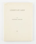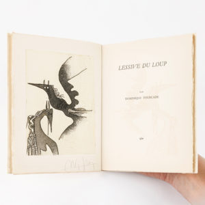 frontispiece verso, printed title, leaf with dedication to René Char and Fourcade's verse, 'Table' and final leaf with achevé d'imprimer and justification. Original publisher's printed wrappers with titles to front cover and spine in black. Dominique Fourcade's 'Lessive du Loup' with Wifredo Lam's original signed etching. From the edition limited to 523 copies, with this unopened copy from the édition de tête of 55 copies on vélin d'Arches with the original etching by Lam signed in pencil as frontispiece; the remaining 460 copies (apart from 8 hors commerce) were issued without the signed frontispiece. Lam's etching was printed in Paris by Georges Leblanc.
