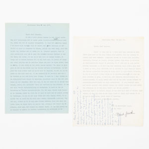 van Bert Decorte, de tweede heeft recto onderaan een geschreven antwoord van Decorte. Snoek polst bij Decorte naar de mogelijkheid om een reisbeurs aan te vragen, maar die laatste antwoordt dat dat moeilijk zal liggen aangezien hij binnenkort in militaire dienst treedt: 'Het feit dat je 3 juni soldaat wordt voor 18 maand brengt jammer genoeg mee dat je intussen moeilijk van dezelfde staat die je aan banden legt geld zou krijgen om er vandoor te gaan.'.