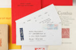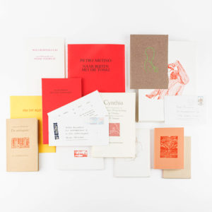 de vijftig Arabisch gen. en gesigneerde ex. Los bijgevoegd: Prospectus. Ingenaaid onder orig. omslag, schuifdoos. Naar buiten met dat nawoord. Los 8vo, in orig. kaft. Los onder orig. kaft, geïll. foedraal. - Cynthia. Latijnse liefdeselegieën van Propertius, Waardenburg en Tibullus in alexandrijnen vertaald door J.P. Guépin. Met lino's van Jimi. Wildert, 1991. 8vo. Ex. nr. 1 van de 50 Arabisch gen. ex. Met de orig. ontwerptekeningen voor de illustraties. Een proefdruk los bijgevoegd net als proefdruk op en vel voor ill. van voorplat en dat onder colophon. Met correspondentie van de illustrator. Ingenaaid onder orig. omslag. - Alice Nahon. Liefde. Met tekeningen van Aukse Ieva Balciubaite. Kalmthout, 2007. 8vo. Nr. 1 van de 60 Arab. gen. ex. Ingenaaid. Schuifdoos. - L.H. Wiener/ Buizerd. Kalmthout, 2017. 8vo. Nr. 1 van de 45 gebonden en Arab. gen. ex. Gesigneerd door de auteur. Los bijgevoegd: Prospectus. Orig. gek. band, stofwikkel, schuifdoos. - Willem Vermandere. Alles gaat over. Kalmthout, 2010. 8vo obl. Nr. 1 van de 45 Arab; gen. ex. Gesigneerd door de auteur. Ingenaaid onder orig. omslag, schuifdoos. - Anton van Wilderode. De antiquair. Libretto met houtsneden van Bram Malisse. Kalmthout, 2019. 8vo. Nr. 1 van de 50 Arab. gen. ex. Orig. gekartonneerde band, schuifdoos. - Peter Simoens. Bibiliografie van de bibliofiele uitgaven van Renaat Bosschaert. Kalmthout, 2015. Kl. 8vo. Nr. 1 van de 60 gen. ex. Orig. gekartonneerde band, schuifdoos. - Johan Velter. Noli reminisci eas. Een bibliografie van het werk van Peter Verhelst 1980 - 1999. Wildert, 2000. 8vo. Orig. omslag. - Fini dat alles. Een onbekende brief van Olympe Jespers uitgegeven door de Vereniging van Antwerpse Bibliofielen ter gelegenheid van de Paul van Ostaijen-tentoonstelling 100 jaar Music-Hall van 7 tot 14 mei 2016. Een van de 75 ex., nr. 61. Orig. omslag. Tot.: 8 ex.