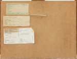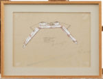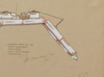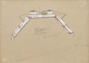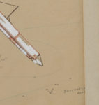 PANAMARENKO (1940-2019) Lithographie, rehaussée à l'encre rouge, gouache sur papier brun avec texte dactylographié "modèle complet d'un vaisseau spatial magnétique moderne. plan 4 à propulsion centrifuge". Signée et datée au crayon. Cadre.