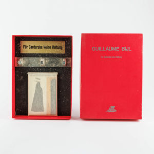 GUILLAUME BIJL (°1946) 'Für Garderobe keine Haftung' (1990) Objet (porte-manteau, cartes postales) dans une boîte rouge. Monogrammé au verso. Numéroté 'A.P. 540'. Edition Rotterdam, Witte de With, 1990.