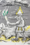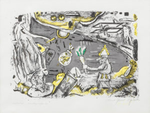 FRED BERVOETS (°1942) & YSBRANT & JAN DECLEIR Lithographie en couleur. Signée par les trois artistes, titrée et annotée "exemplaire d'exposition (99)". Cadre. Avec dédicace manuscrite et dessin (Bervoets) au verso du cadre.