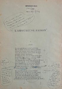 Paris, Imprimerie Chaix, 18 août 1904 ; grand in-4 de 12 feuillets verts imprimés d’un seul côté contrecollés sur papier fort, demi-maroquin bleu marine à larges coins, dos à nerfs. Épreuves corrigées d’un recueil de huit poèmes de Charles Derennes. D’abondantes corrections critiques (remarques sur la syntaxe, questions de fond sur le texte…) semblent provenir d’un correcteur avisé plutôt que de l’auteur lui-même. Elles sont peut-être l’œuvre de l’éditeur de la Revue de Paris, Edmond de Fels, dans laquelle les poèmes parurent le 1er octobre 1904 (n°19).