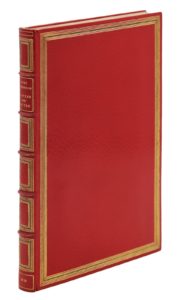 Paris, Georges Crès, 1913 ; in-12 maroquin cerise, encadrement sur les plats de 7 filets dorés et un fin listel noir, dos à nerfs orné de caissons du même décor, cadre intérieur de maroquin souligné de 9 filets dorés, doublures et gardes de moire rouge, doubles gardes, tranches dorées, couverture (Semet et Plumelle).Frontispice et ornements gravés par Pierre Vibert. A la fin, 9 pages de fac-similé du manuscrit de l’auteur.