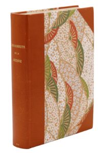 Paris, Émile-Paul frères, 1916 ; in-8 demi-basane orangée à coins, papier à motifs d’éventails multicolores, tête dorée couverture restaurée et doublée (Patrice Goy).Édition originale de ce florilège de sonnets inédits par une trentaine de poètes dont Lucie Delarue-Mardrus, Auguste Dorchain, Edmond Rostand… Frontispice de Combet-Descombes.