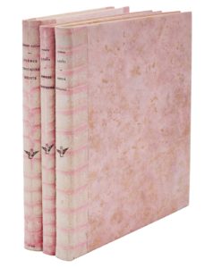 Réunion de 3 titres en 3 vol. in-4, demi-daim à bandes imitation crocodile rose et gris, plats de papier rose et doré, dos lisses à l’œser noir ornés de phallus ailés, têtes dorées, couvertures (Patrice Goy).