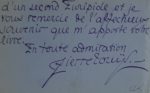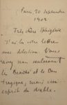 Il est enrichi de 8 intéressantes pages manuscrites à l’état de brouillon, intercalées aux pages auxquelles elles se rapportent. – Le volume est aussi truffé d’un mot autographe de Pierre Louÿs pour remercier pour Iphigénie et d’une lettre de Moréas à « Iphigénie » (Louise Silvain).