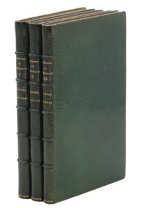 Paris, Jouaust, 1879 ; 3 vol in-12, reliures jansénistes de l’époque maroquin vert anglais, dos à nerfs, dentelle intérieure, ébarbés (K. Kauffmann).Recueil de chansons qui firent les délices des salons parisiens sous le Second Empire, et que l’éditeur qualifie plutôt de poèmes et de contes. Il est orné de 12 eaux-fortes par Edmond Morin.