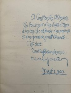 Tirage à 150 exemplaires. Un des 10 sur Chine, celui-ci enrichi d’un envoi autographe très intime à Constantin Ullmann « en souvenir d’un buste d’Ajax, d’un caniche absurde, d’une pantoufle et d’une paire de gants éternelle »… – Dos bruni.