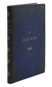 [Paris, imprimé chez Alcan-Lévy], mars 1886 ; 7 fascicules en un vol. demi-chagrin bleu, dos à nerfs orné d’une fleur dorée, titre doré sur le plat supérieur, premier plat de couverture conservé. Rarissime réunion complète des 7 livraisons, contenant des textes de Rodolphe Darzens, Pierre Quillard, Camille Bloch, Maeterlinck, Éphraïm Mickael etc. Un hors-texte. Théodore de Banville présente cette nouvelle revue avec bonté, décrivant les poètes qui la composent comme une nuée de rossignols lançant leurs trilles de printemps. Interrompue un moment la revue reprendra en 1889 puis deviendra le Mercure de France.