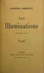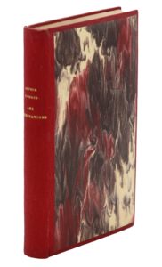 Les Illuminations. Troisième édition. Paris, Mercure de France, 1914 : in-16, maroquin rouge, les plats recouverts d’un rectangle de papier reliure rouge, blanc et noir, dos lisse, tête dorée, couverture (Duhayon). – N° 2421 sur vélin.
