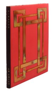 Paris, Pichon, 1914 ; grand in-4, reliure vers 1950, plats recouverts de papier canson fuchsia, recouverts d’un motif en cuivre géométrique s’entrecroisant aux angles, dos lisse de maroquin noir, doublures de papier noir, gardes de papier reliure rosé, couverture et dos (Mercher).Belle édition typographique imprimée par Pichon en hommage à Rimbaud, tirée à 150 exemplaires – 50 Japon et 100 Hollande – par souscription. La liste des souscripteurs figure en tête : d’Annunzio, Paul Claudel, André Gide, Stuart Merril, Jean Hugo, etc.
