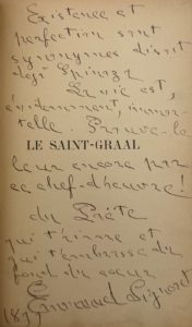 Envoi enflammé de l’auteur à Mécislas Galberg, sa grande écriture couvrant le faux-titre, son vis- à-vis blanc et la page de sa photo : « la vie est évidemment immortelle. Prouve-le-leur par ce chef d’œuvre… »