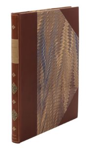 Paris, Société des Amis du Livre Moderne, 1930 ; in-4, demi-maroquin noisette à coins, dos lisse orné de motifs dorés et mosaïqués en différents tons, doublures et gardes de moire sable, tranches dorées sur témoins, couverture et dos, étui (D. Montécot).Frontispice et 26 ravissantes compositions art déco de Manuel Orazi gravées sur bois et tirées en couleurs avec rehauts d’or et d’argent.