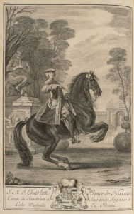 Parmi les planches, six portraits équestres représentent le prince Charles de N assau , Monsieur de K raut et trois des fils du duc de S aint -A ignan dont La Guérinière était le maître d’équitation.
