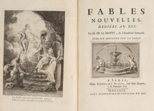 L a MOTTE (Antoine Houdard de ). Fables nouvelles […] Avec un Discours sur la Fable . A Paris, Chez Grégoire Dupuis, 1719. In-4°, veau blond, dos à nerfs orné (reliure mi-XVIII e s.) .
