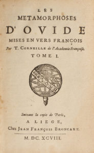 OVIDE. Les Métamorphoses. Mises en vers françois par T. Corneille . A Liege, Chez Jean François Broncart, 1698. 3 volumes in-12, veau, dos à nerfs ornés (reliure de l’époque) .