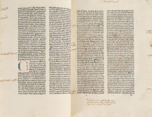 ÉDITION INCUNABLE ENTIÈREMENT RUBRIQUÉE de ce commentaire des Sentences de PIERRE LOMBARD par le théologien GRÉGOIRE de RIMINI (1300-1358), Général de l'ordre des ermites de saint Augustin en 1357 .